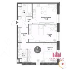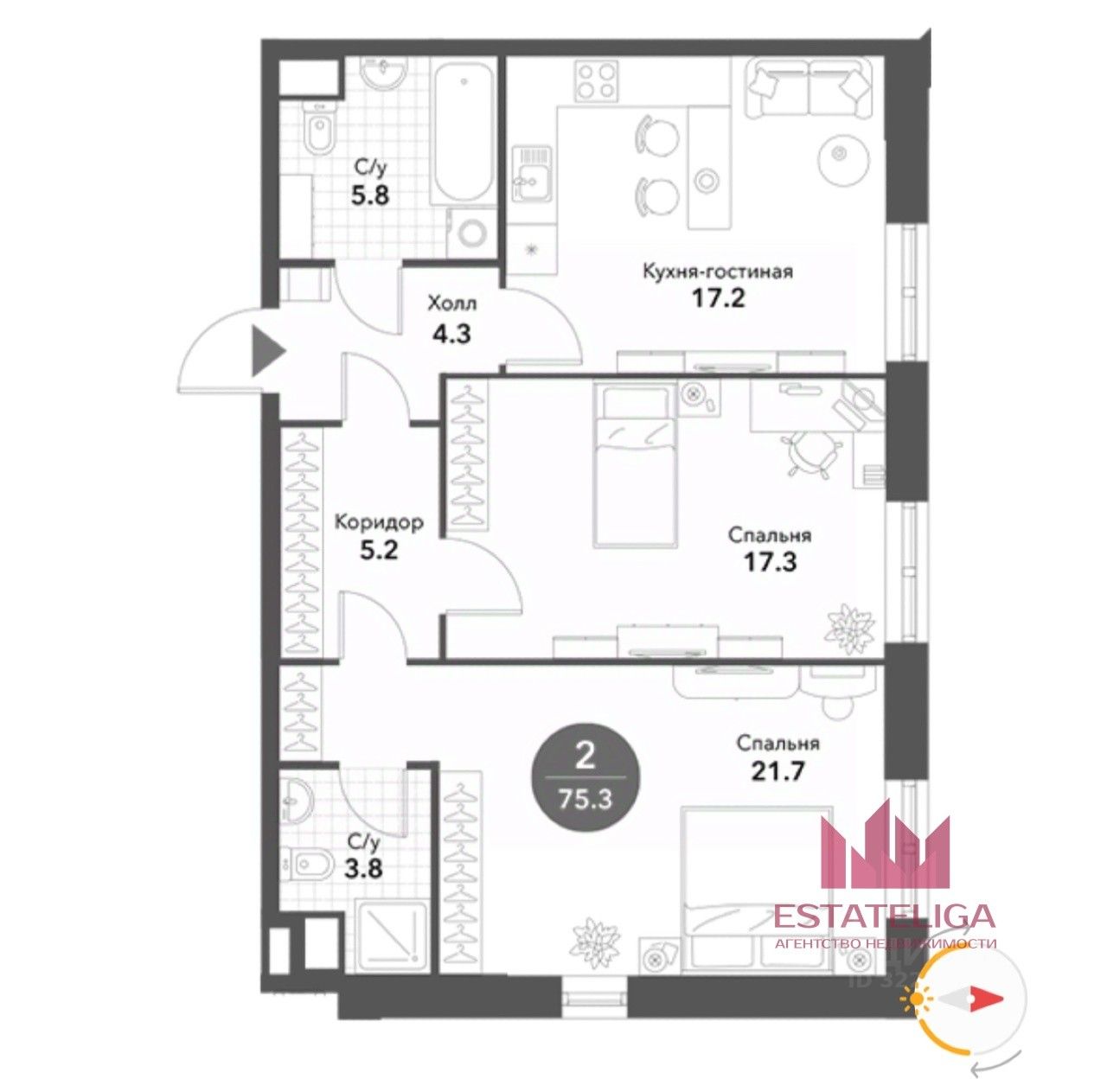 Id 56100. Продаются апартаменты с двумя спальнями общей площадью 75,3 кв.м. в комплексе бизнес-класса Voxhall.