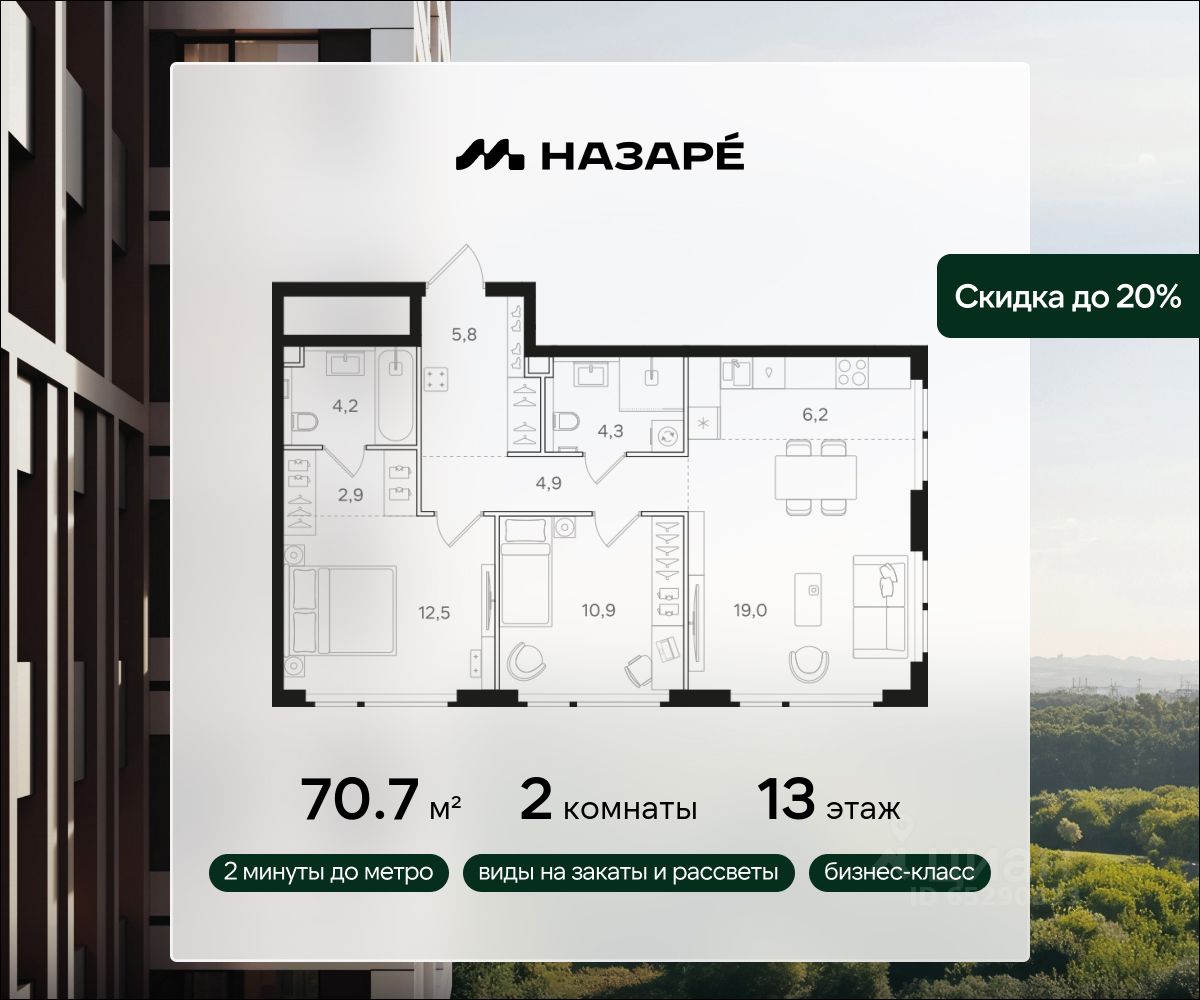 Продается 2-комнатная квартира в ЖК "НАЗАРЕ'" Общая площадь - 70.70 Тип дома - монолитный Этаж - 13 Год сдачи - 2028 Предлагается квартира площадью 70.70 кв. м в новом современном квартале на востоке Москвы, прямо у станций метро и МЦК "Бульвар Рокоссовского". Квартира располагается в корпусе 2 на 13 этаже комплекса бизнес-класса "НАЗАРЕ'". Стоимость указана с учетом скидки 10%, ваша выгода составит 3 340 575 рублей! Полная стоимость квартиры без скидки 33 405 750 рублей. Великолепная транспортная доступность: • 2 минуты ходьбы до метро и МЦК "Бульвар Рокоссовского"; • 3 минуты на авто - удобный выезд на СВХ (МСД); • 10 минут на авто до национального парка "Лосиный остров"; • 10 минут на авто до "Измайловского парка"; • 15 минут до авто до парка "Сокольники"; • 15 минут занимает выезд на ТТК, • 18 минут на авто до Садового кольца. Индивидуальная архитектура в современном стиле: • шесть башен переменной высотности от 24 до 43 этажей, в том числе одна высотная 143-метровая доминанта, которая станет достопримечательностью востока Москвы; • авторы архитектурной концепции - знаменитое бюро СПИЧ (среди их работ - башня "Федерация", новое здание Третьяковской галереи, реконструкция БСА "Лужники" и др.); • торгово-развлекательный комплекс с фитнес-центром, детской игровой комнатой и открытыми террасами прямо возле квартала; • дизайнерские лобби от бюро ABOVE ARCHITECTURE с панорамными окнами, интерьерами в теплой цветовой гамме и мягкой зоной ожидания располагаются в каждой башне; • корпуса расположены так, чтобы из окон открывались потрясающие виды на закаты и рассветы, зеленые панорамы или огни мегаполиса; Особенности расположения "НАЗАРЕ'" находится максимально близко к метро, и в то же время проект вписан в уже существующую инфраструктуру зеленого столичного района Богородское. Это обеспечивает быстрый доступ ко всем нужным объектам инфраструктуры (детские сады, школы, медцентры, магазины, салоны красоты, фитнес-клубы, футбольные поля, спортивные школы), а также к живописным зеленым зонам - национальному парку "Лосиный остров", парку "Сокольники", Черкизовскому детскому парку, Измайловскому лесопарку с усадьбой Измайлово. Собственная инфраструктура и благоустройство Шесть башен квартала будут объединены цокольным этажом, в который можно попасть как с улицы, так и со стороны лобби. Здесь разместятся необходимые для комфортной повседневной жизни кофейни, супермаркет, рестораны, магазины и многое другое. В комплексе предусмотрен вместительный двухуровневый подземный паркинг с келлерами для хранения сезонных вещей. Во дворе комплекса "НАЗАРЕ'" будут места как для спокойного отдыха и работы, так и для игр и спорта. Здесь организованы игровые площадки для детей всех возврастов, места для стритбола и тенниса, а также зона с природным ландшафтом и коворкинг с экологичной деревянной мебелью.