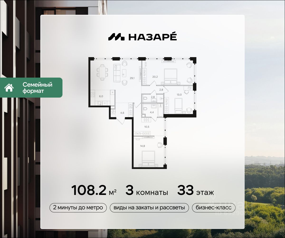 Предлагается квартира площадью 108.20 кв. м в новом современном квартале на востоке Москвы, прямо у станций метро и МЦК "Бульвар Рокоссовского". Квартира располагается в корпусе 5 на 33 этаже комплекса бизнес-класса "НАЗАРЕ'".