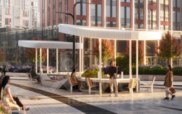Приватное трехуровневое пространство с всесезонным озеленением, амфитеатром и лаунж-зонами, уличным коворкингом, плейхабом и скалодромом. На придомовой территории расположится уникальный для Москвы объект - скала из натурального камня с водопадом.