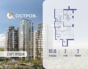 Продаётся 2-комн. квартира от застройщика: общая площадь 90.10 м², жилая 26.80 м², кухня 37.10 м², 3-й этаж, жилой квартал "Остров 12", корпус 1 (секция 2). Срок сдачи: 1 квартал 2029 года.