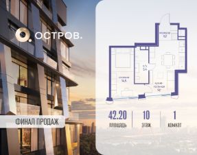 Продаётся 1-комн. квартира от застройщика: общая площадь 42.20 м², жилая 14.50 м², кухня 19.10 м², 10-й этаж, жилой квартал "Остров 12", корпус 2 (секция 1). Срок сдачи: 1 квартал 2029 года.