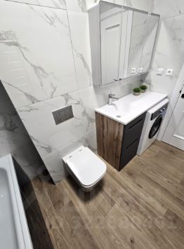 В квартире выполнен качественный ремонт из дорогих материалов. Установлен кухонный гарнитур со встроенной бытовой техникой. На полу ламинат 34 класса износостойкий и керамогранит. Достаточное количество розеток. Установлены кондиционеры в каждой комнате. В прихожей вместительная кладовая. Полностью оборудованный санузел с сантехникой и стиральной машиной.