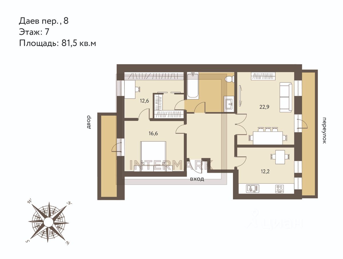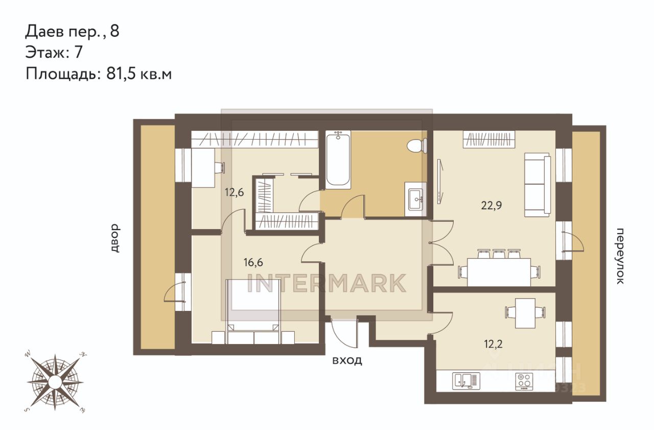 Даев, 8 - кирпично-монолитный дом 1997 года постройки, аккуратные входные группы, консьерж, фиксированное машино-место на огороженной внутренней территории. В пешей доступности расположены станции метро Сухаревская и Чистые Пруды, премиальный фитнес-клуб с бассейном, несколько супермаркетов, прогулочная зона бульварного кольца.