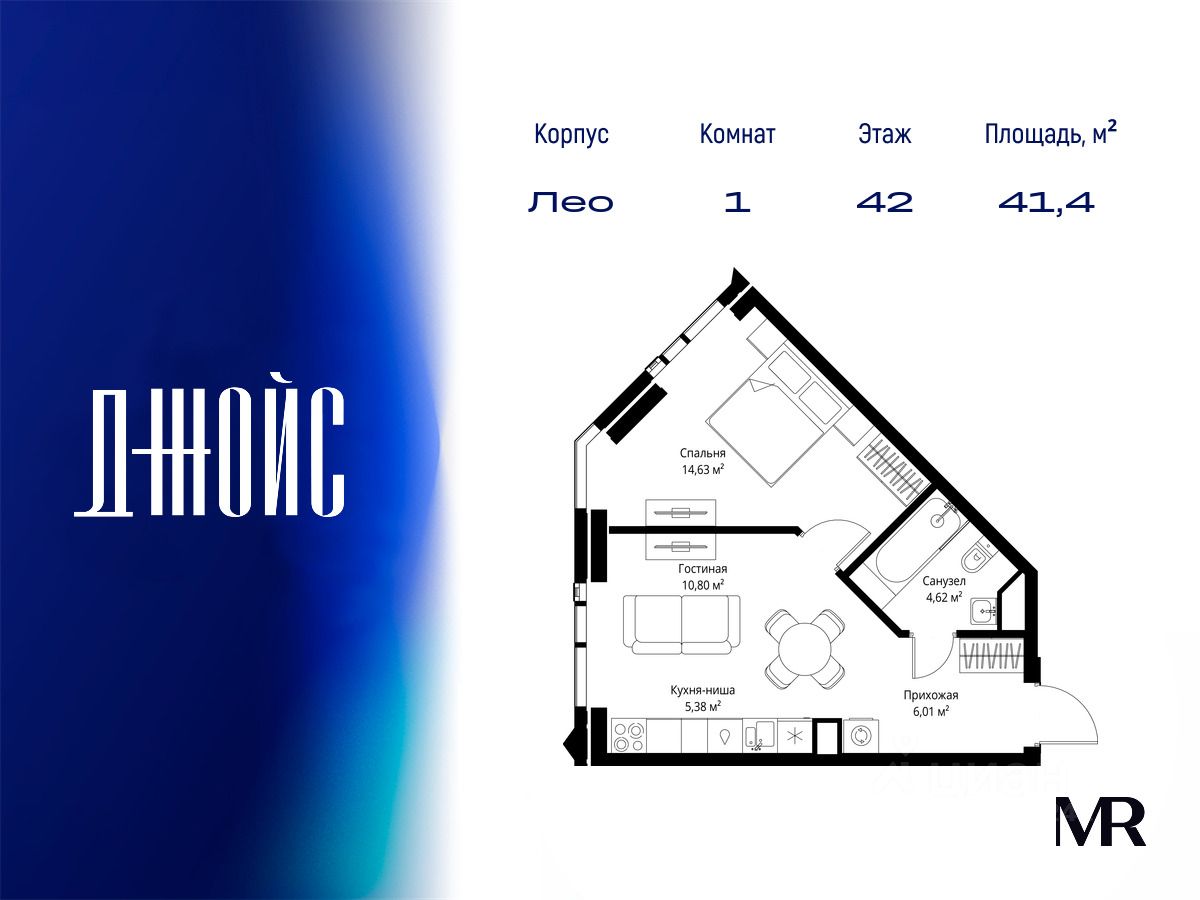 В продаже квартира площадью 41.44 м² без отделки на 42 этаже 46 этажного дома. Квартира расположена в корпусе Лео.