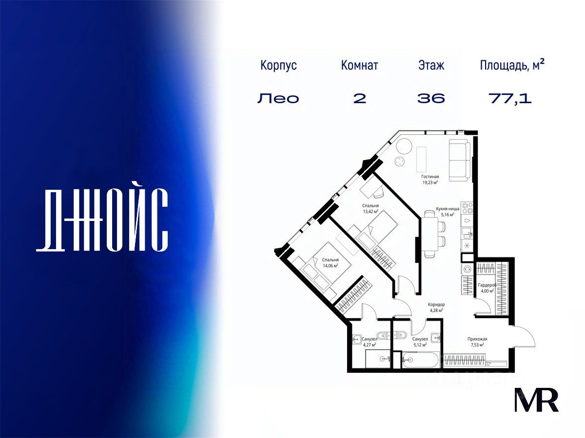 В продаже квартира площадью 77.07 м² без отделки на 36 этаже 46 этажного дома. Квартира расположена в корпусе Лео.