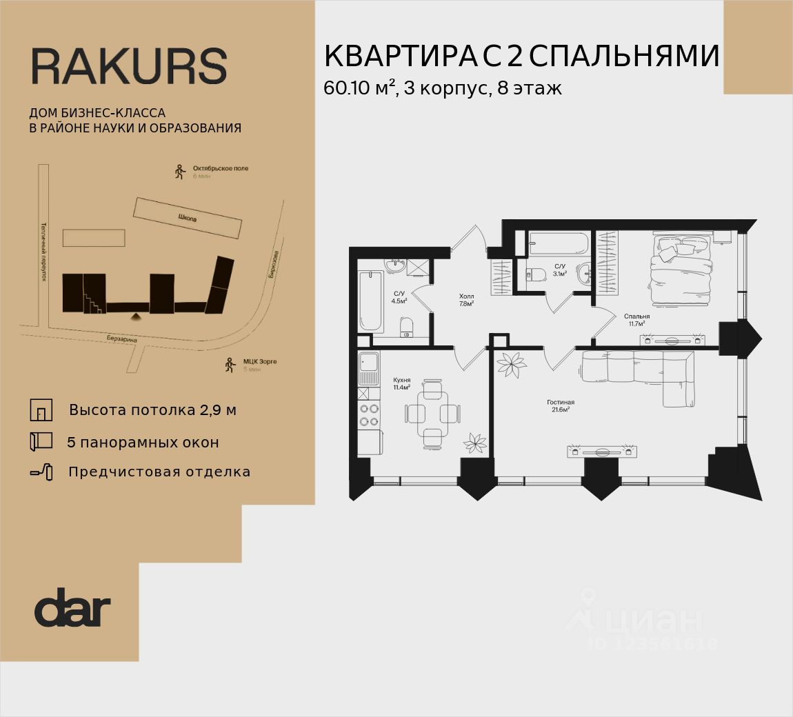 Продаётся 2-комнатная квартира 60.10 м² в жилом комплексе Ракурс. Квартиру отличают панорамное остекление, потолки 2,9 м, улучшенная шумо и воздухоизоляция. Дом сдаётся в 1 квартале 2028 года, продажи проходят через эскроусчета. Подземный паркинг, коворкинг, закрытая благоустроенная территория с фонтаном и артобъектами. Гибкие условия покупки.