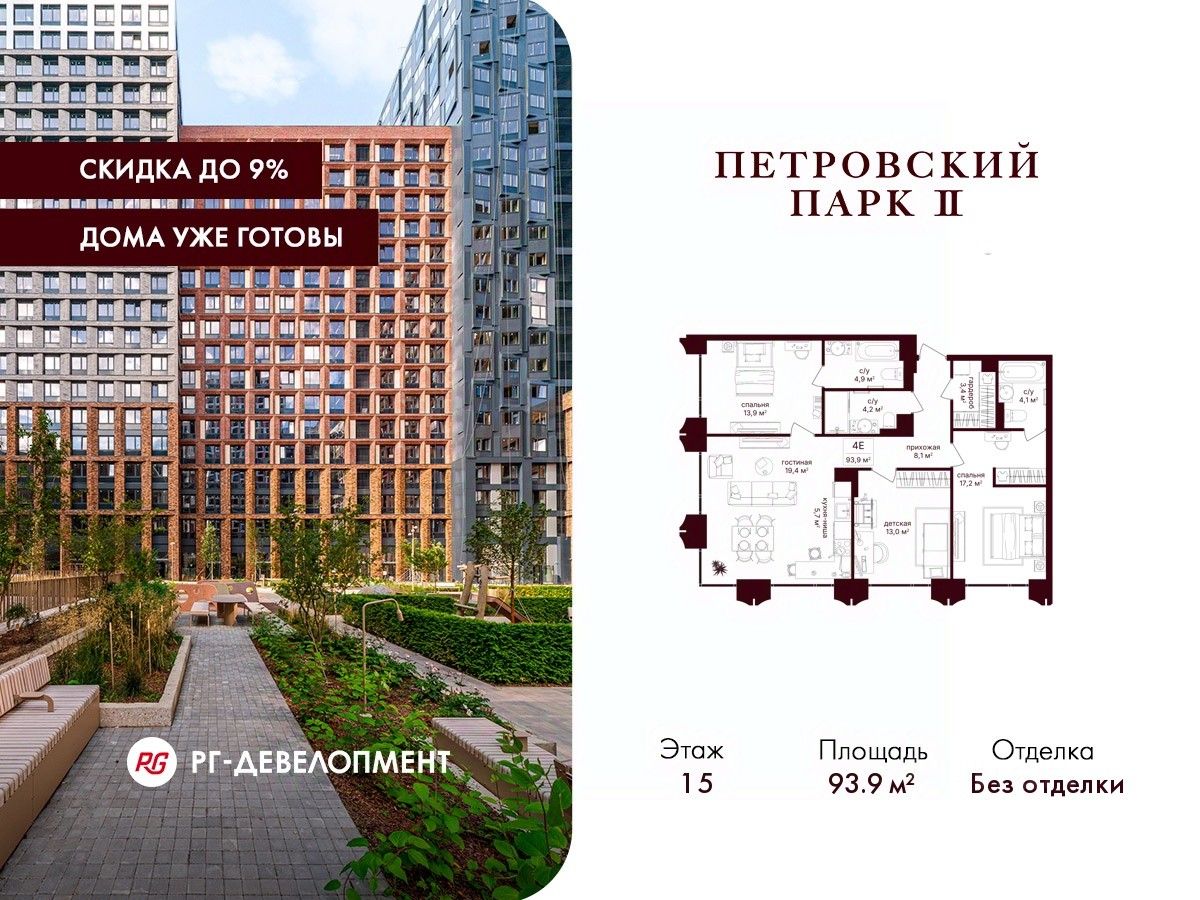 Продаётся 3-комнатная квартира 93,9 кв.м. в ЖК "Петровский парк II" на 15-м этаже 25 этажного дома.