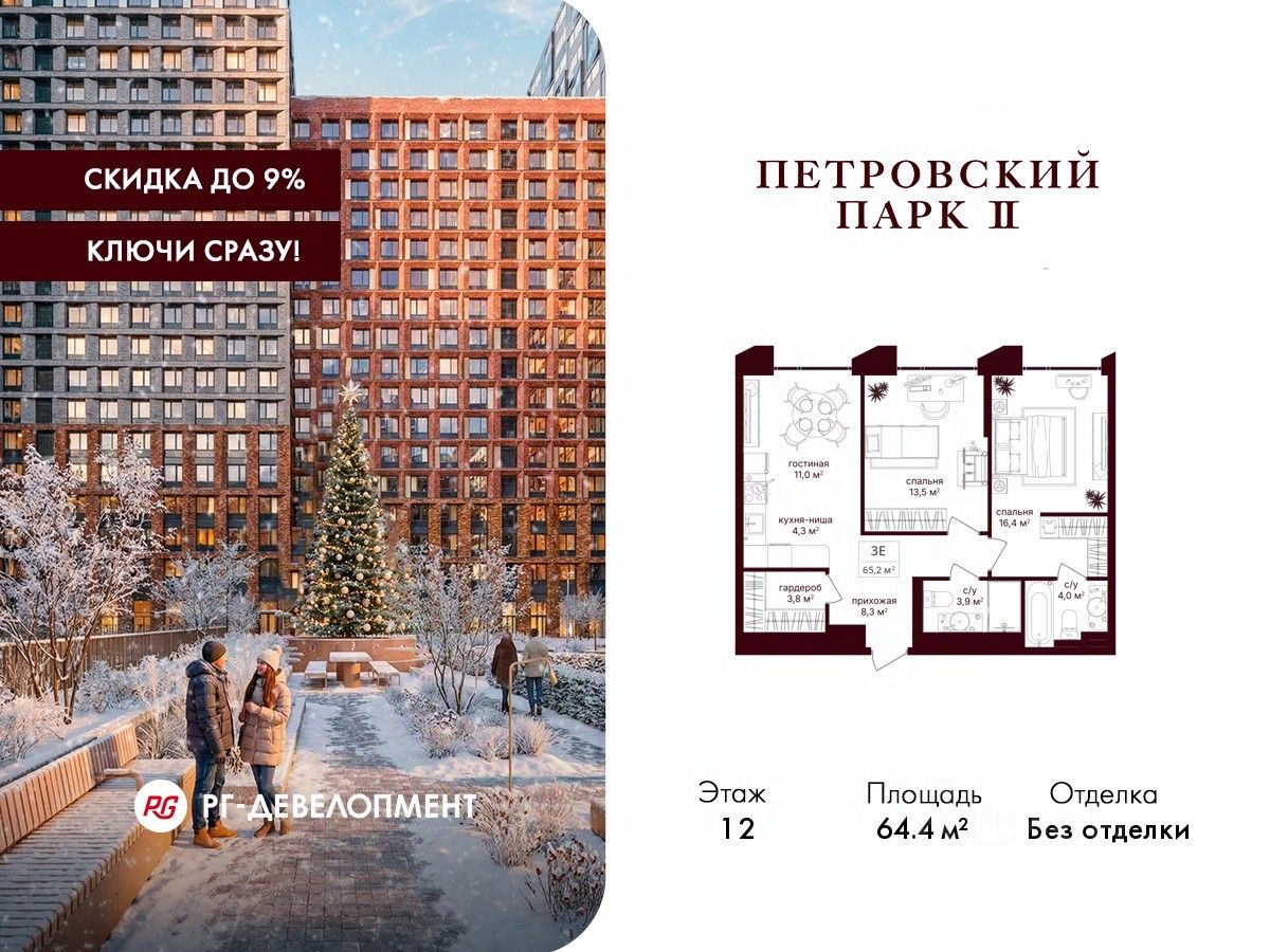 Продаётся 2-комнатная квартира 64.4 кв.м. в ЖК "Петровский парк II" на 12-м этаже 21 этажного дома.