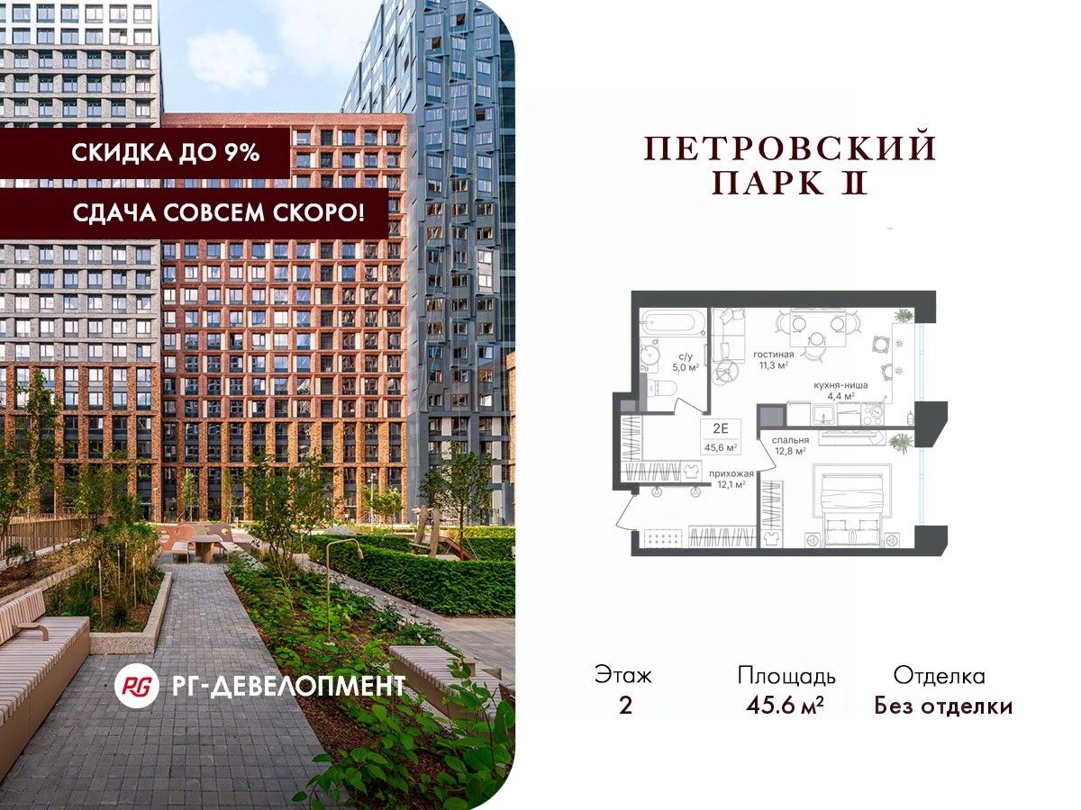 Продаётся 1-комнатная квартира 45,6 кв.м. в ЖК "Петровский парк II" на 2-м этаже 17 этажного дома.