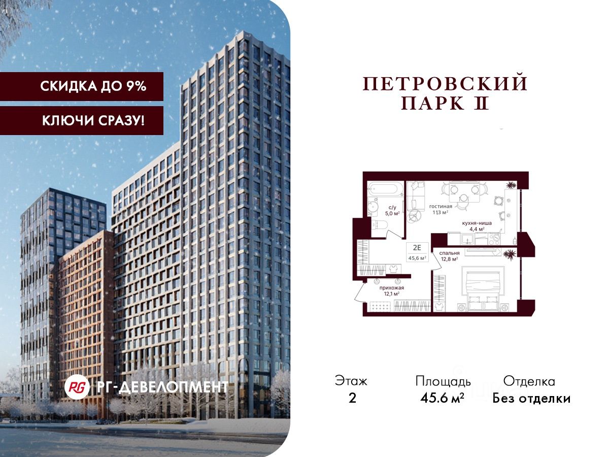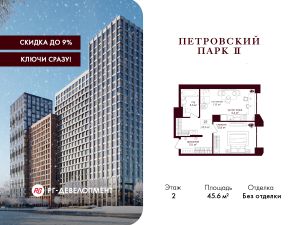 Продаётся 1-комнатная квартира 45.6 кв.м. в ЖК "Петровский парк II" на 2-м этаже 17 этажного дома.