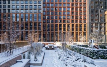 Внутренний двор комплекса - это отдельный мир, закрытый от машин и городского шума. Ландшафтный дизайн отсылает к регулярным дворцовым садам: геометрия аллей, зелёные "кабинеты", цветники и камерные зоны отдыха создают разные сценарии для повседневной жизни. Здесь органично соседствуют детские игровые пространства, плейхаб, спортивные зоны и тихие места для отдыха.