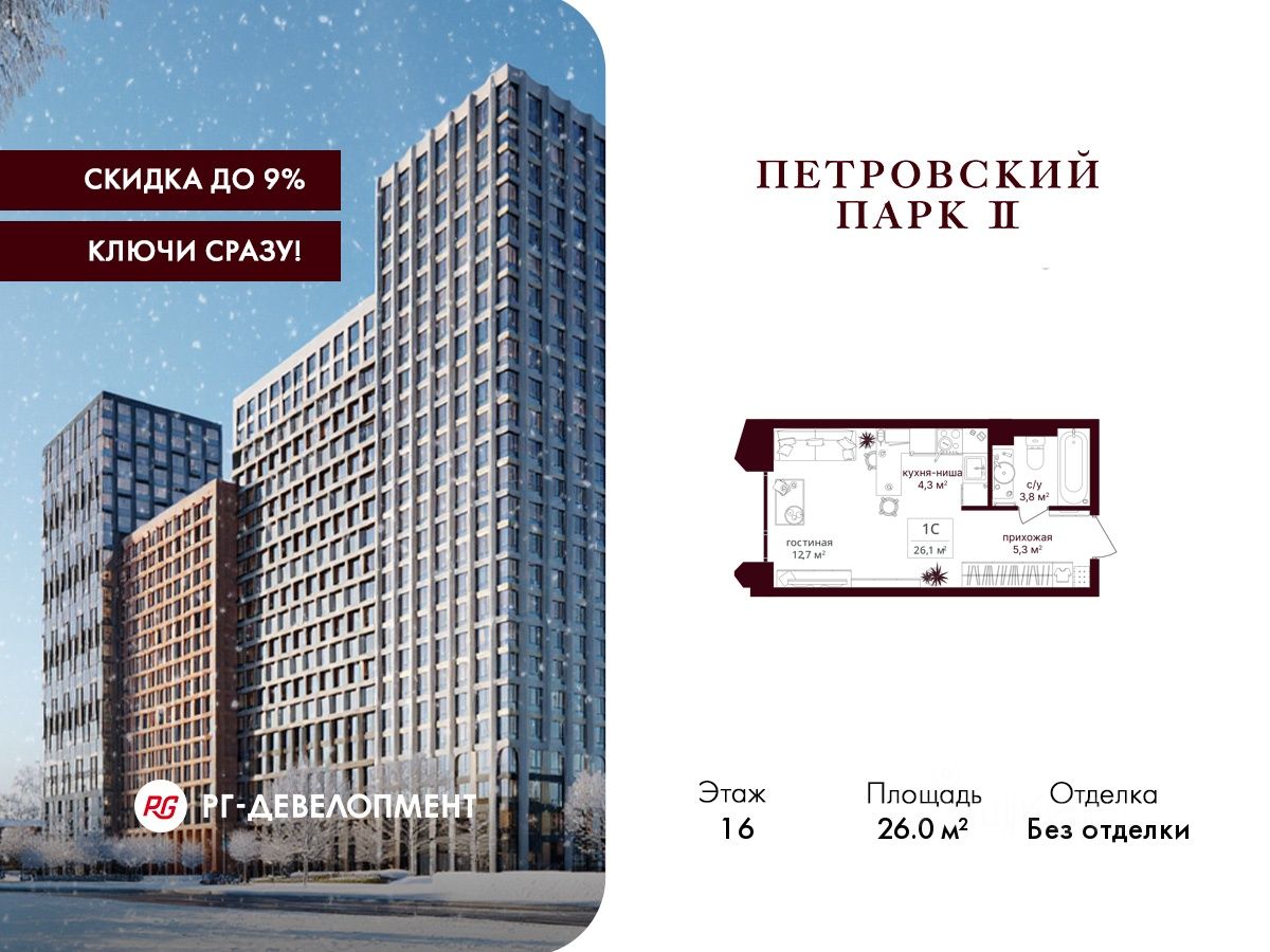 Продаётся Студия 26.0 кв.м. в ЖК "Петровский парк II" на 16-м этаже 19 этажного дома.
