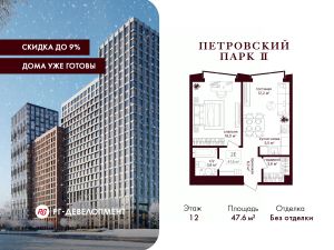 Продаётся 1-комнатная квартира 47,6 кв.м. в ЖК "Петровский парк II" на 12-м этаже 25 этажного дома.