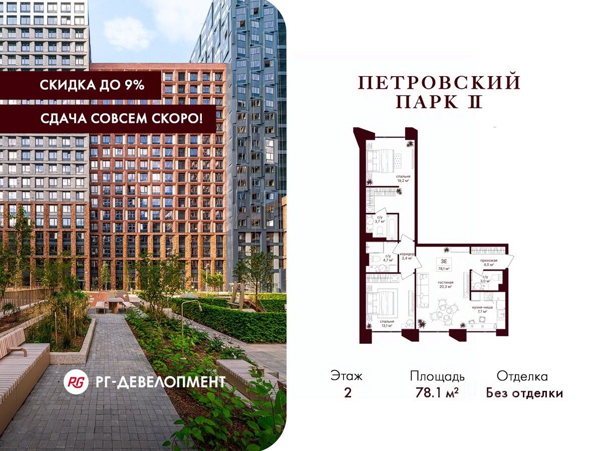 Продаётся 2-комнатная квартира 78,1 кв.м. в ЖК "Петровский парк II" на 2-м этаже 17 этажного дома.