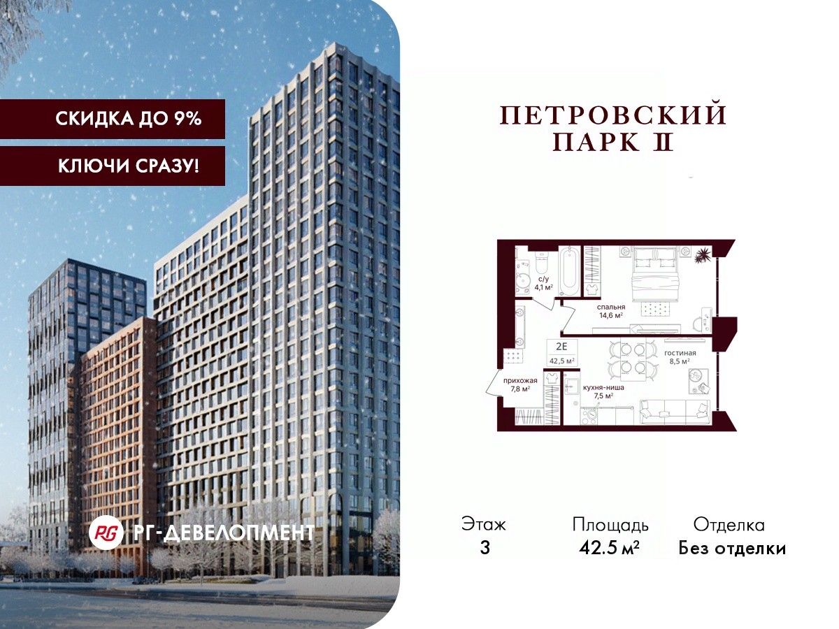 Продаётся 1-комнатная квартира 42.5 кв.м. в ЖК "Петровский парк II" на 3-м этаже 17 этажного дома.