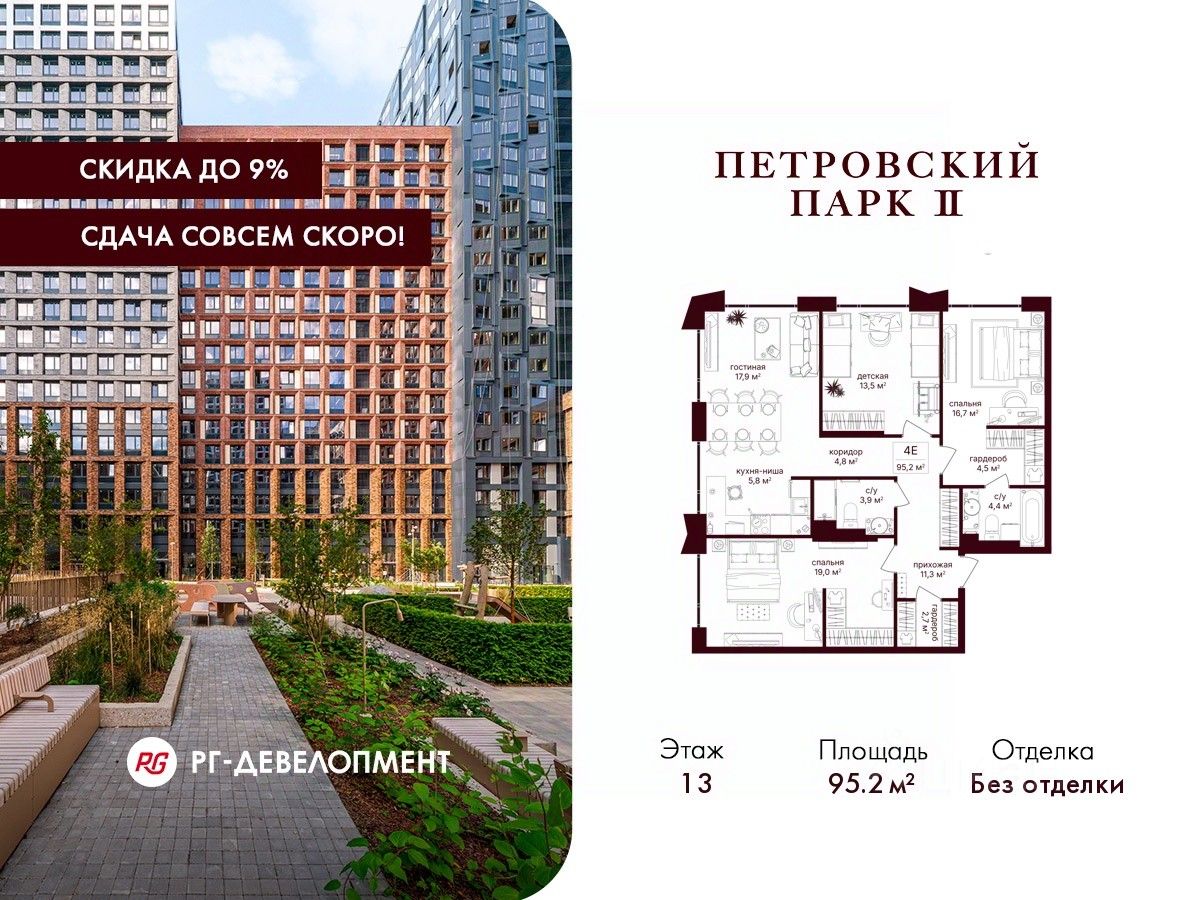 Продаётся 3-комнатная квартира 95,2 кв.м. в ЖК "Петровский парк II" на 13-м этаже 24 этажного дома.