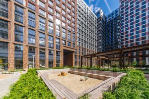 На закрытой территории зеленые зоны с цветниками, места для отдыха, спортивные и игровые площадки.
