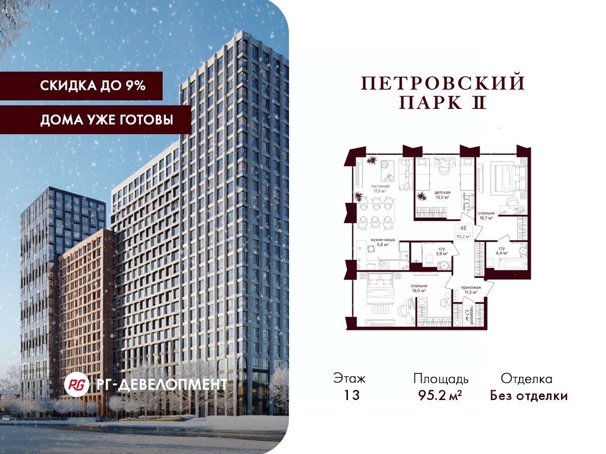 Продаётся 3-комнатная квартира 95.2 кв.м. в ЖК "Петровский парк II" на 13-м этаже 24 этажного дома.