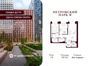 Продаётся 2-комнатная квартира 73,7 кв.м. в ЖК "Петровский парк II" на 12-м этаже 17 этажного дома.