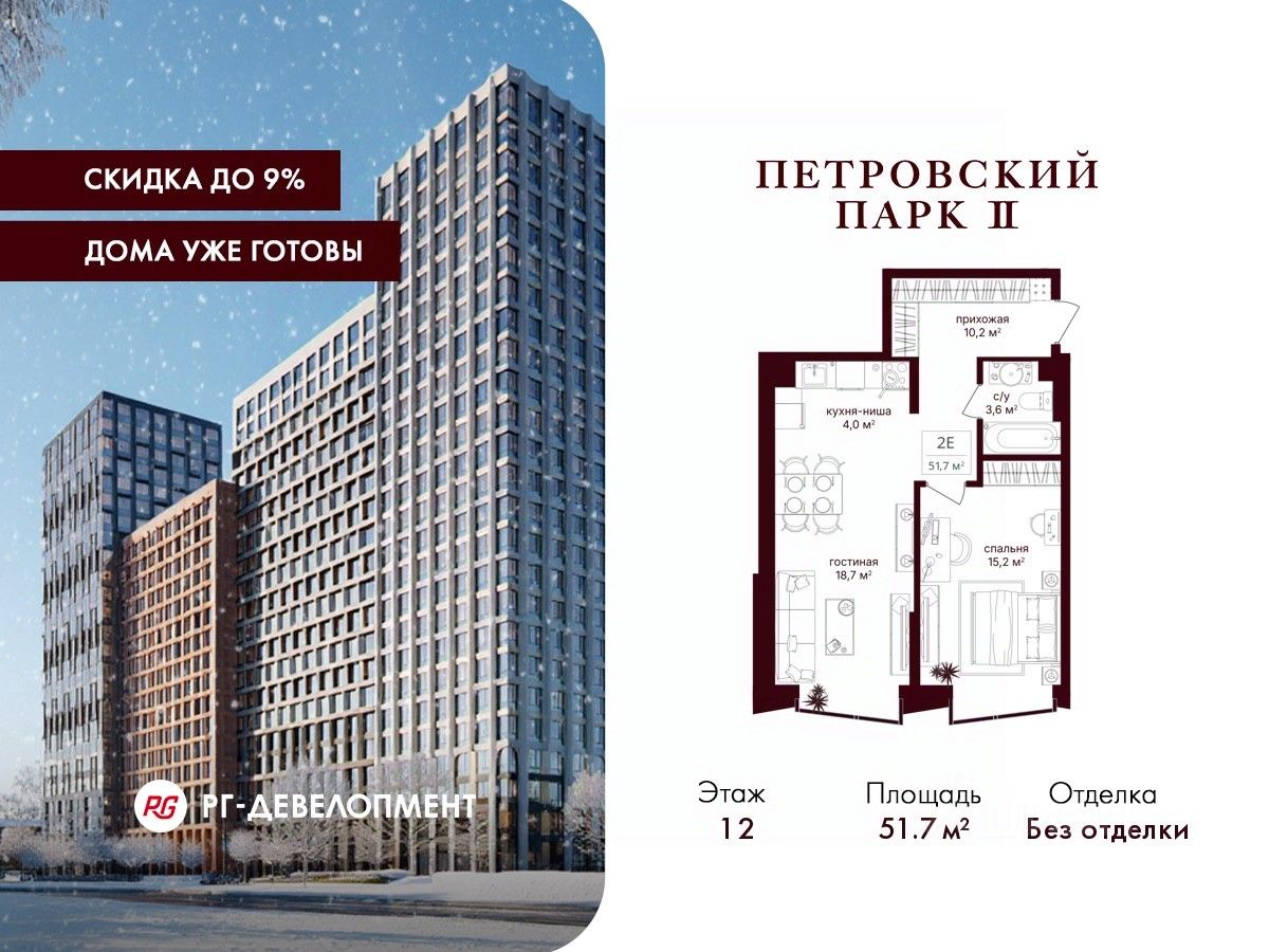Продаётся 1-комнатная квартира 51,7 кв.м. в ЖК "Петровский парк II" на 12-м этаже 25 этажного дома.