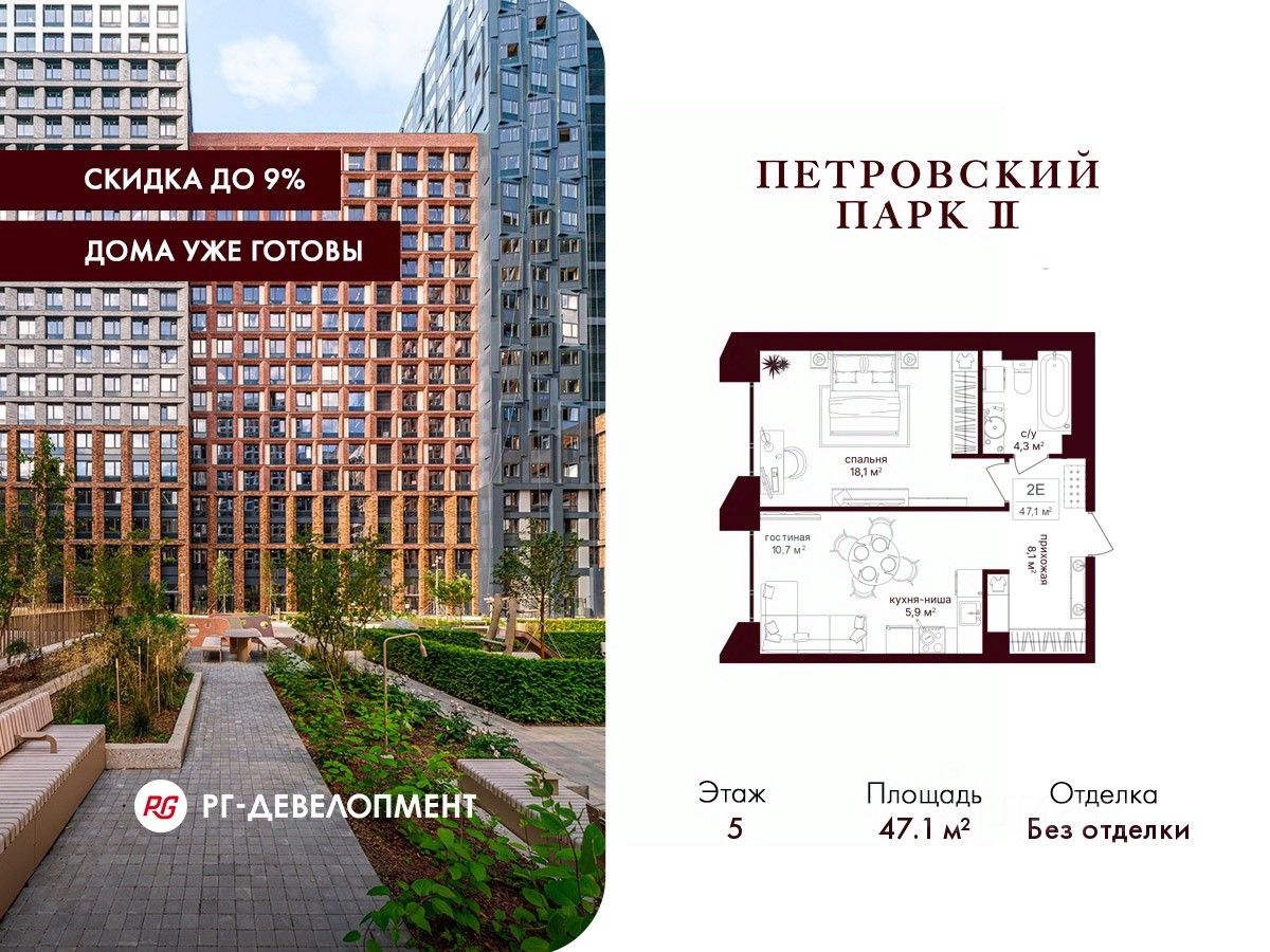 Продаётся 1-комнатная квартира 47,1 кв.м. в ЖК "Петровский парк II" на 5-м этаже 19 этажного дома.