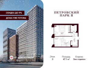 Продаётся 1-комнатная квартира 47.2 кв.м. в ЖК "Петровский парк II" на 5-м этаже 19 этажного дома.