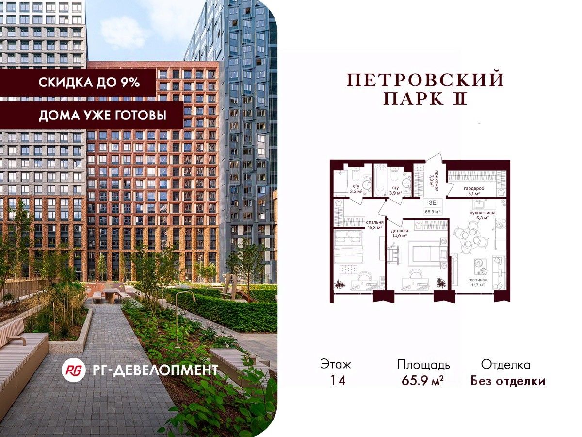Продаётся 2-комнатная квартира 65,9 кв.м. в ЖК "Петровский парк II" на 14-м этаже 24 этажного дома.
