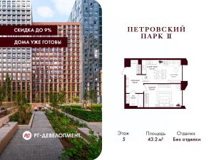 Продаётся 1-комнатная квартира 43,2 кв.м. в ЖК "Петровский парк II" на 5-м этаже 19 этажного дома.