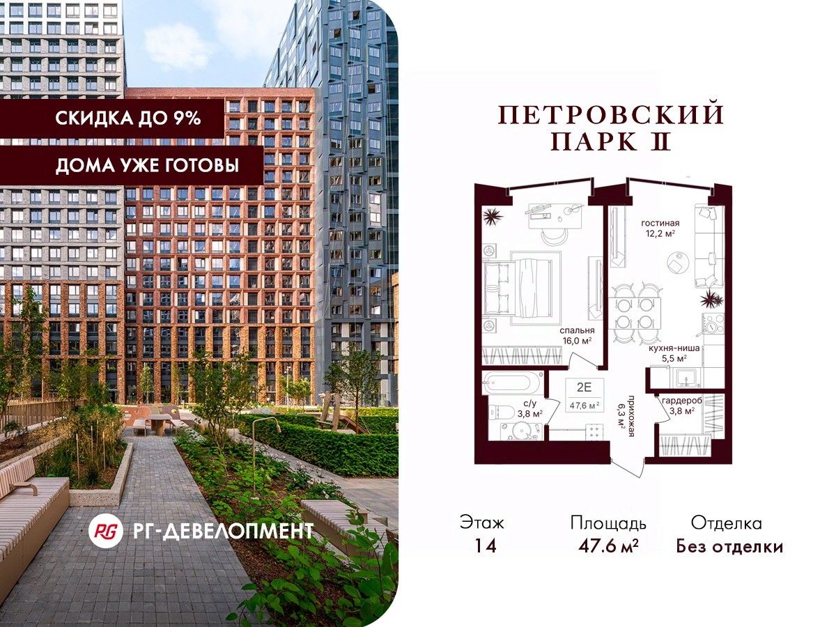 Продаётся 1-комнатная квартира 47,6 кв.м. в ЖК "Петровский парк II" на 14-м этаже 25 этажного дома.