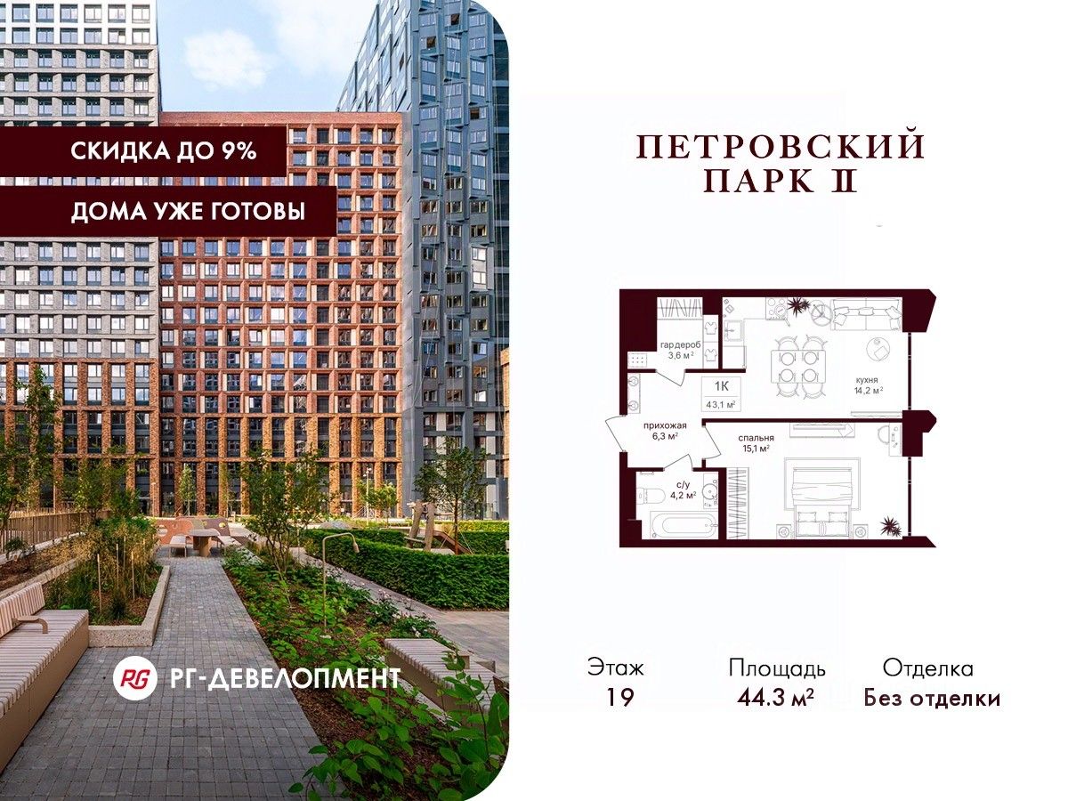 Продаётся 1-комнатная квартира 44,3 кв.м. в ЖК "Петровский парк II" на 19-м этаже 19 этажного дома.