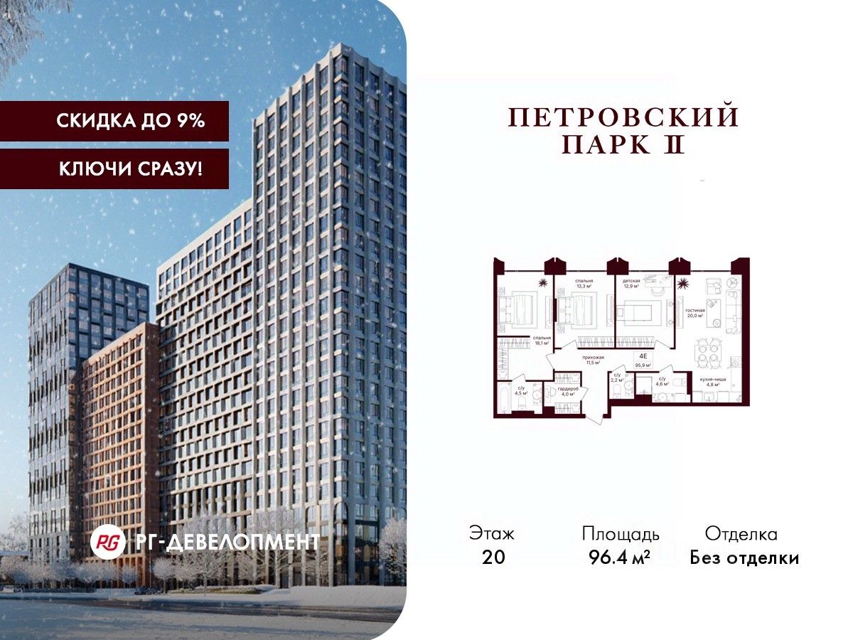 Продаётся 3-комнатная квартира 96.4 кв.м. в ЖК "Петровский парк II" на 20-м этаже 25 этажного дома.