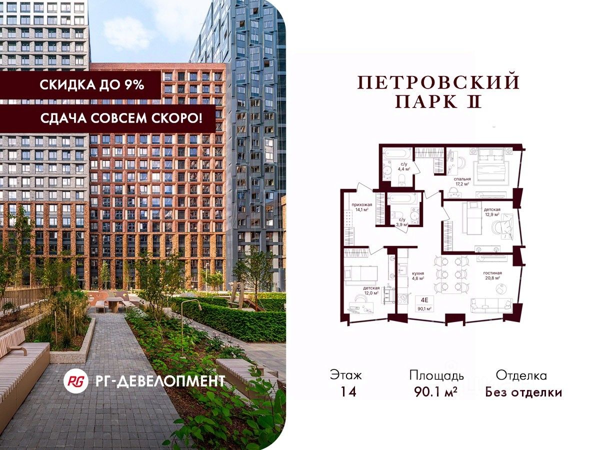 Продаётся 3-комнатная квартира 90,1 кв.м. в ЖК "Петровский парк II" на 14-м этаже 25 этажного дома.