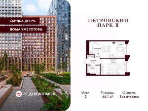 Продаётся 1-комнатная квартира 44,1 кв.м. в ЖК "Петровский парк II" на 2-м этаже 15 этажного дома.