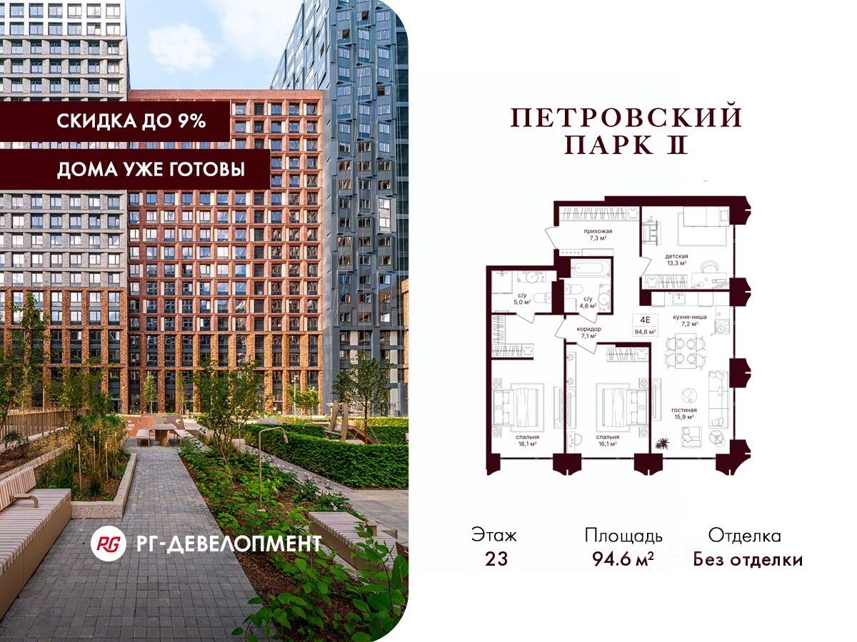Продаётся 3-комнатная квартира 94,6 кв.м. в ЖК "Петровский парк II" на 23-м этаже 25 этажного дома.