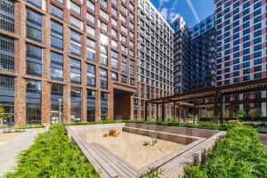 • Закрытый двор без машин, вдохновлённый эстетикой дворцовых садов;