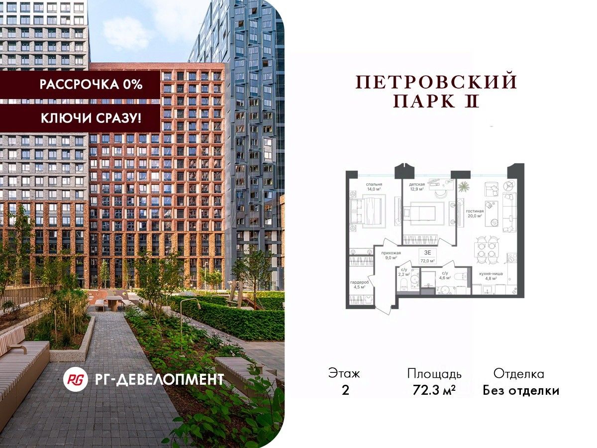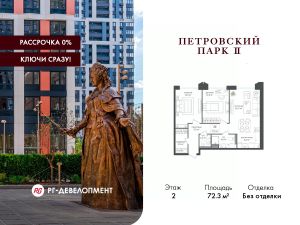 Продаётся 2-комнатная квартира 72.3 кв.м. в ЖК "Петровский парк II" на 2-м этаже 25 этажного дома.