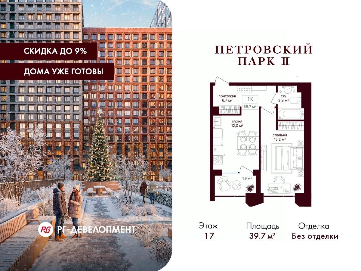 Продаётся 1-комнатная квартира 39.7 кв.м. в ЖК "Петровский парк II" на 17-м этаже 17 этажного дома.