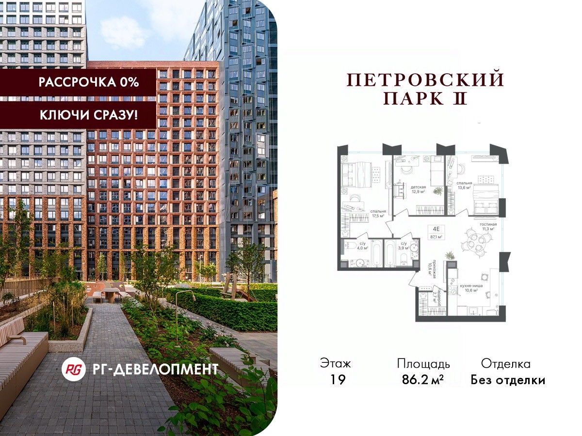 Продаётся 3-комнатная квартира 86.2 кв.м. в ЖК "Петровский парк II" на 19-м этаже 24 этажного дома.