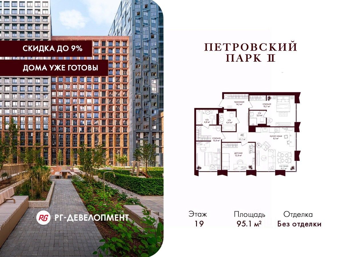 Продаётся 3-комнатная квартира 95,1 кв.м. в ЖК "Петровский парк II" на 19-м этаже 24 этажного дома.