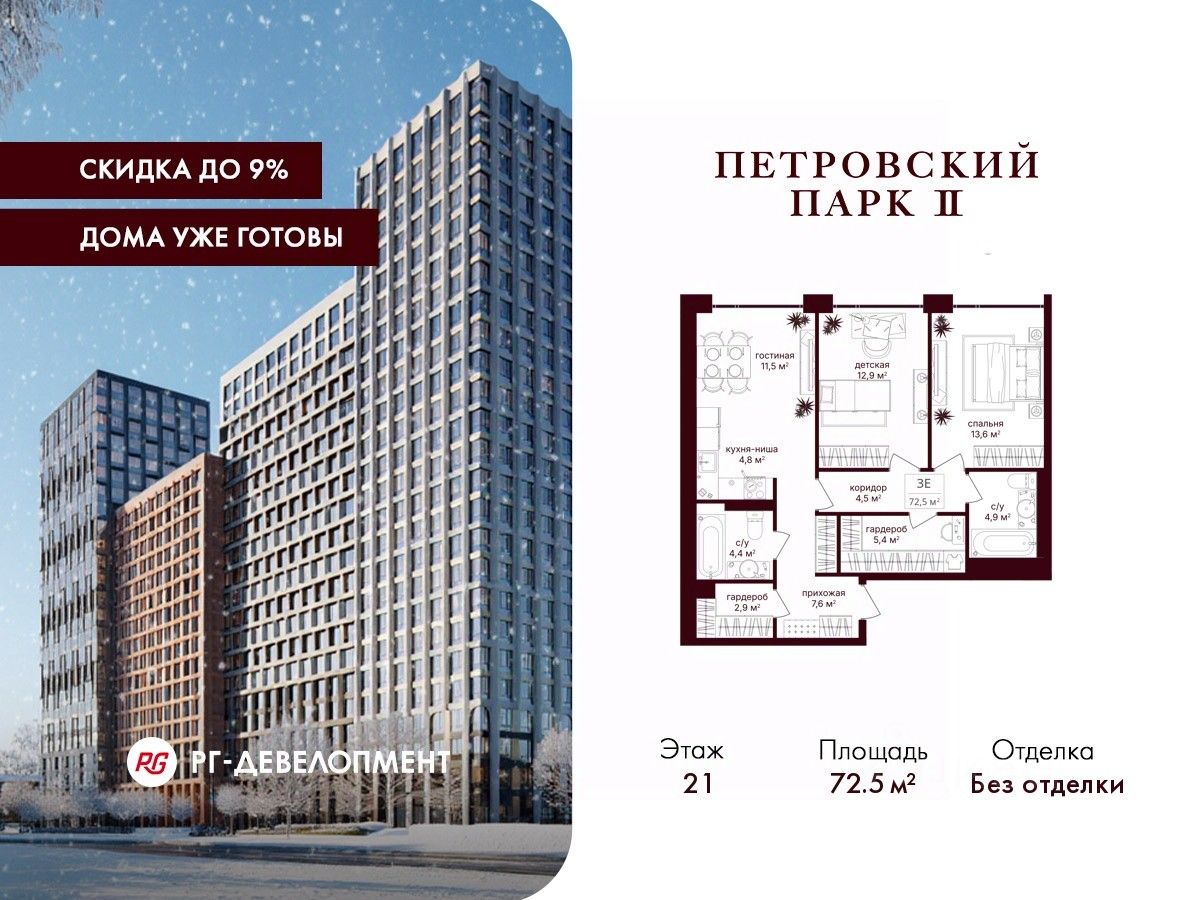 Продаётся 2-комнатная квартира 72,5 кв.м. в ЖК "Петровский парк II" на 21-м этаже 21 этажного дома.