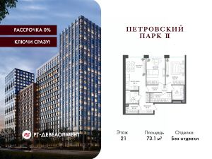 Продаётся 2-комнатная квартира 73.1 кв.м. в ЖК "Петровский парк II" на 21-м этаже 21 этажного дома.