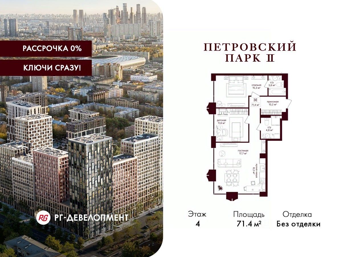 Продаётся 2-комнатная квартира 71.4 кв.м. в ЖК "Петровский парк II" на 4-м этаже 25 этажного дома.