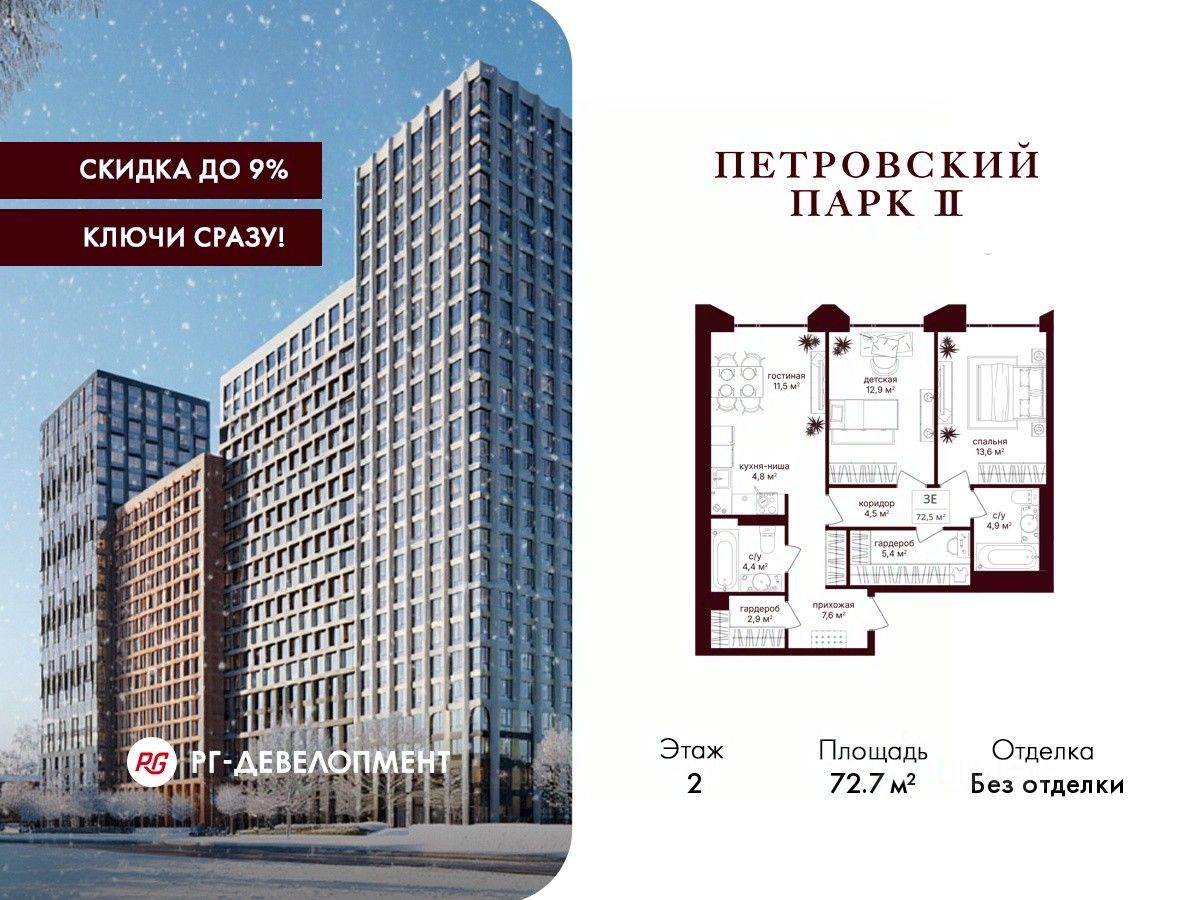 Продаётся 2-комнатная квартира 72.7 кв.м. в ЖК "Петровский парк II" на 2-м этаже 21 этажного дома.
