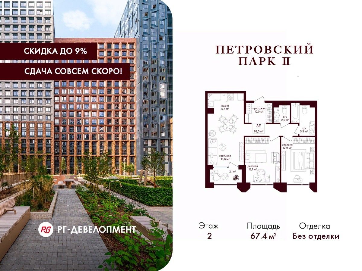 Продаётся 2-комнатная квартира 67,4 кв.м. в ЖК "Петровский парк II" на 2-м этаже 17 этажного дома.