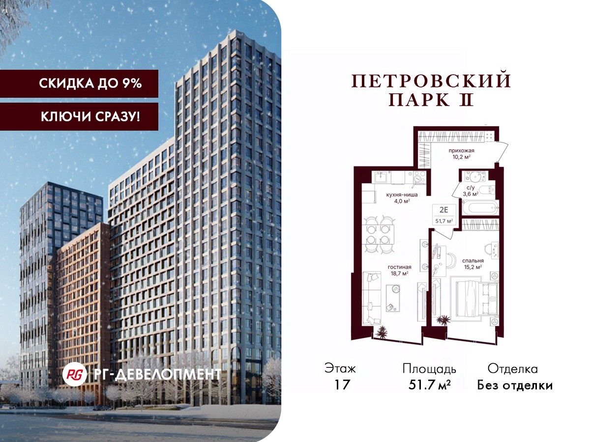 Продаётся 1-комнатная квартира 51.7 кв.м. в ЖК "Петровский парк II" на 17-м этаже 25 этажного дома.
