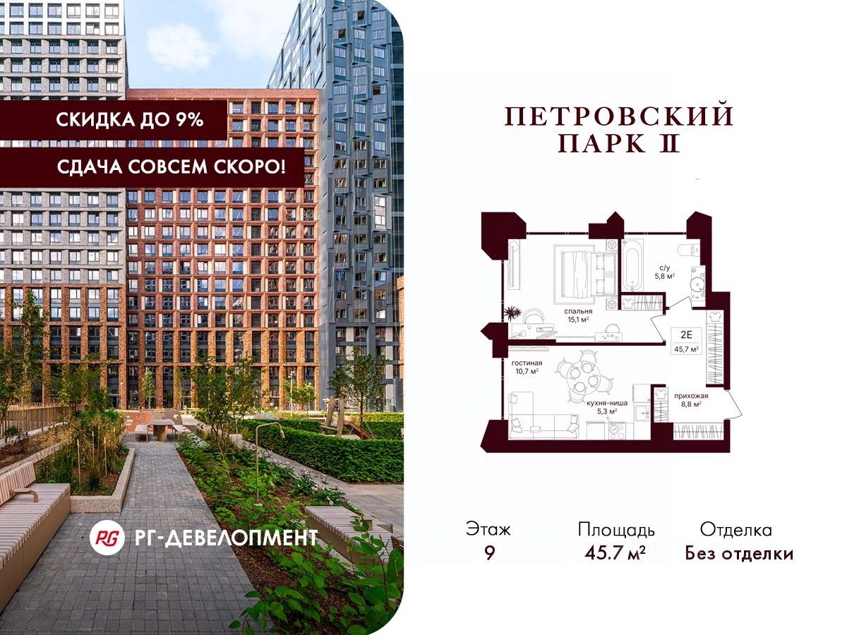 Продаётся 1-комнатная квартира 45,7 кв.м. в ЖК "Петровский парк II" на 9-м этаже 19 этажного дома.