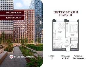 Продаётся 1-комнатная квартира 42.7 кв.м. в ЖК "Петровский парк II" на 2-м этаже 21 этажного дома.