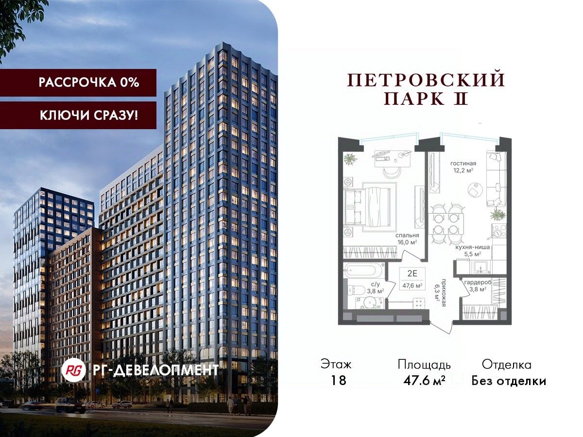 Продаётся 1-комнатная квартира 47.6 кв.м. в ЖК "Петровский парк II" на 18-м этаже 25 этажного дома.