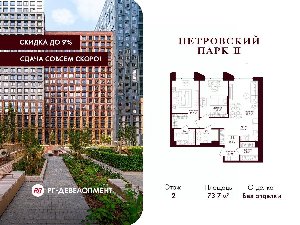 Продаётся 2-комнатная квартира 73,7 кв.м. в ЖК "Петровский парк II" на 2-м этаже 17 этажного дома.